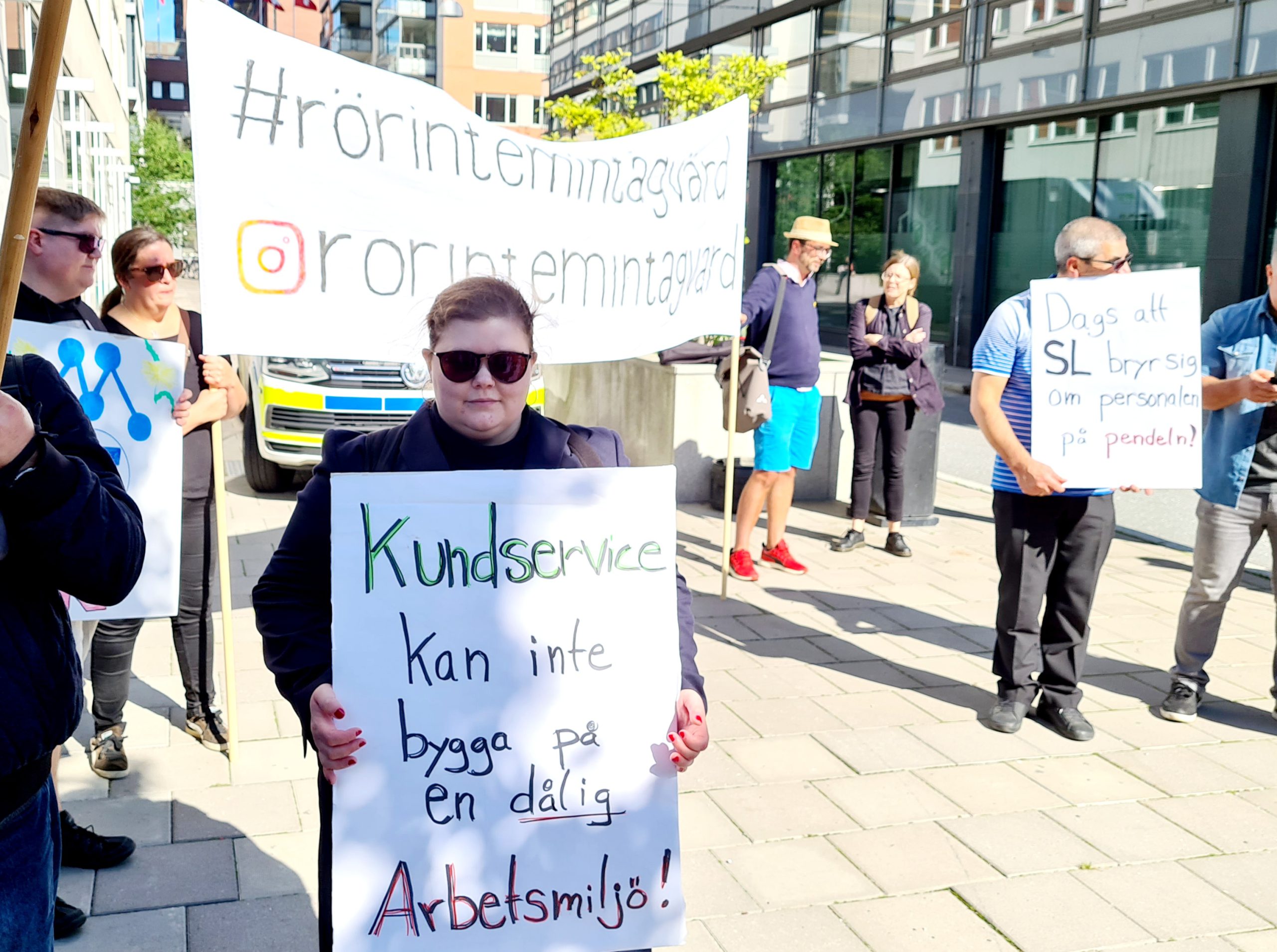 Det var tåg- och stationsvärdar, pendeltågsförare, kundservicevärdar och städare som samlades utanför SL:s huvudkontor på Lindhagensgatan på Kungsholmen för att uttrycka sitt missnöje.