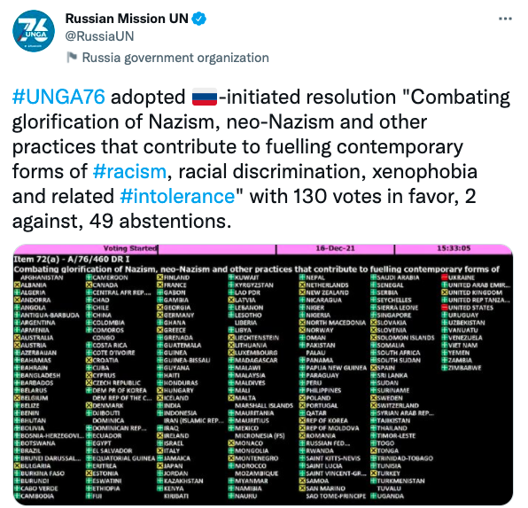 Resolutionen antogs av FN:s generalförsamling den 16 december förra året med 130 röster för. Två länder röstade emot: USA och Ukraina. 49 USA-allierade stater lade ner sina röster, däribland Sverige och övriga EU-länder.