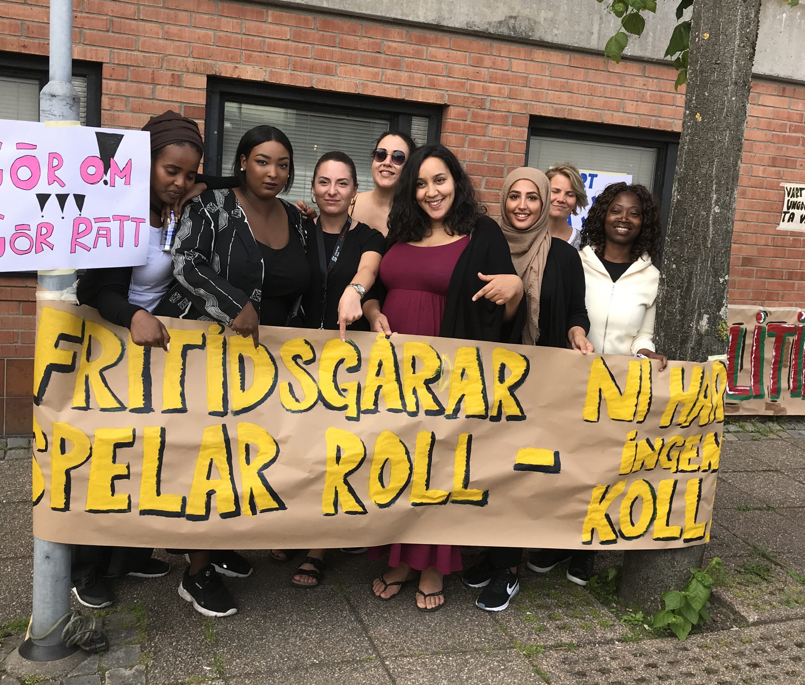 Lina Renhom Nyby berättar att ungdomarna gjort många plakat. De hade också lagt ut en välkomnande inbjudan till manifestationen på gårdens twitterkonto. Den blev dock stoppad av stadsdelsnämnden. Till sådant får inte kommunens konto användas.