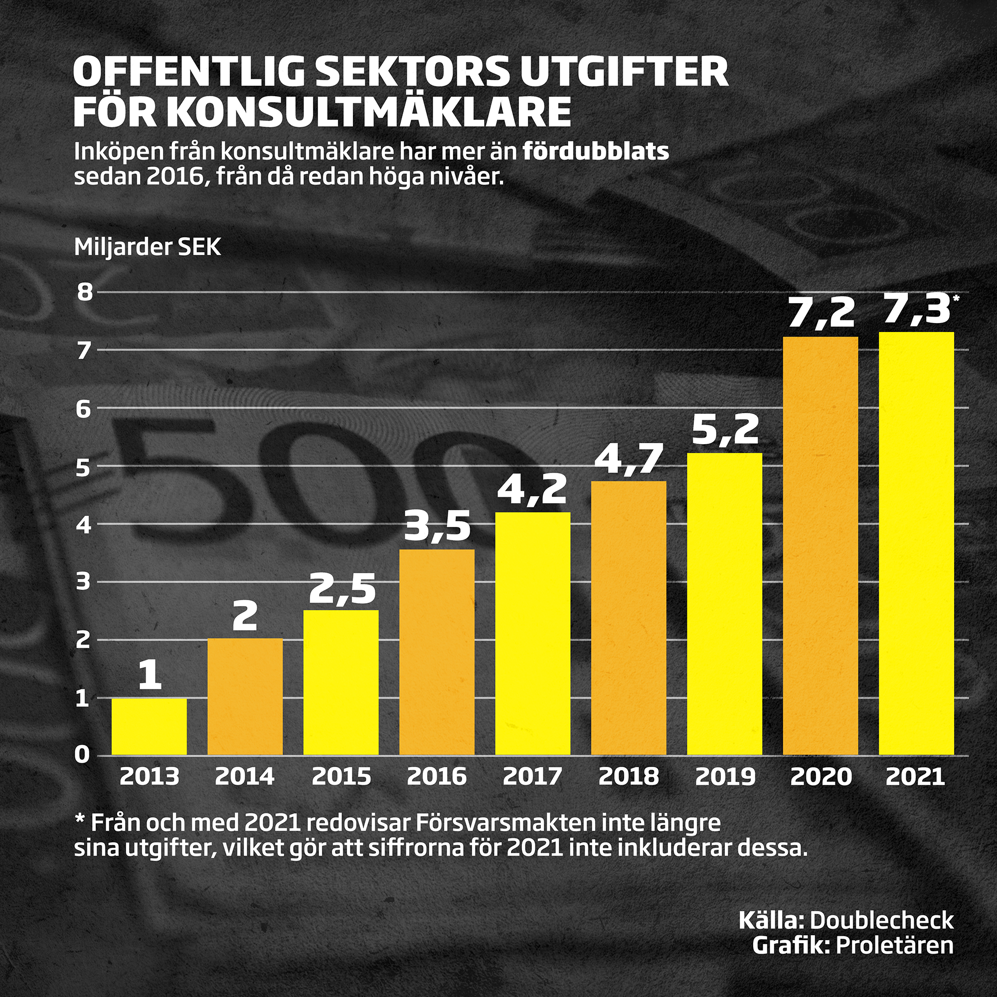År 2021 stod de två största konsultmäklarföretagen för över 80 procent av hela den offentliga marknaden för mellanhänder. Det faktum att det ena av dessa företag haft en omsättning på över 4 miljarder kronor (från enbart fyra offentliga kunder) visar att det är en snedvriden konkurrens, enligt rapporten. Störst av alla konsultköpare är Region Stockholm.