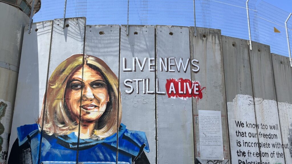 Muralmålning av den mördade journalisten Shireen Abu Akleh på Västbanken. Fotograf: Wikimedia/Dan Palraz