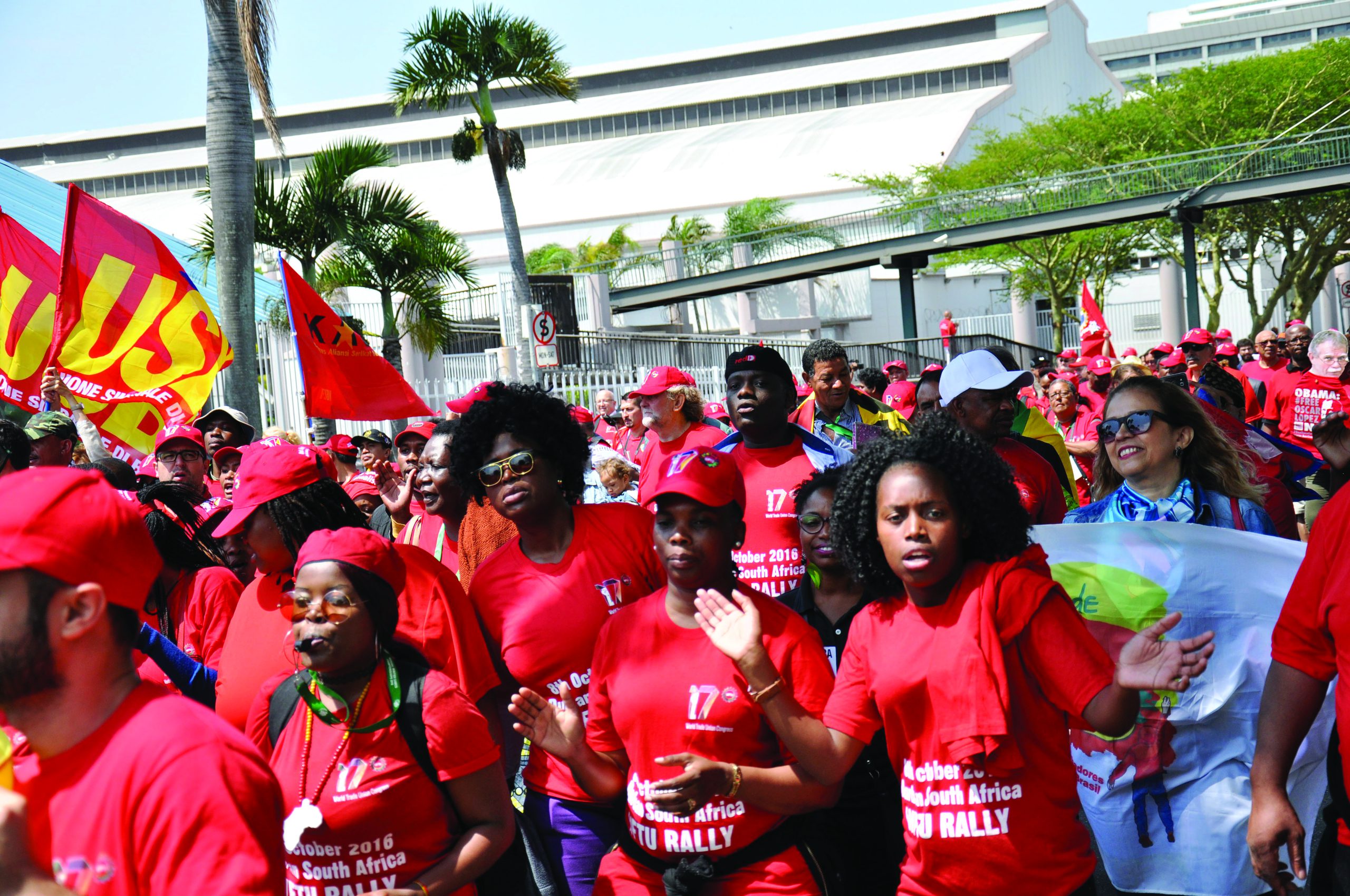 Här deltar radikala och stridbara sydafrikanska fackliga organisationer som reser dagskrav som förbud mot bemanningsföretag, lagstadgad minimilön och gratis utbildning för de fattiga.
