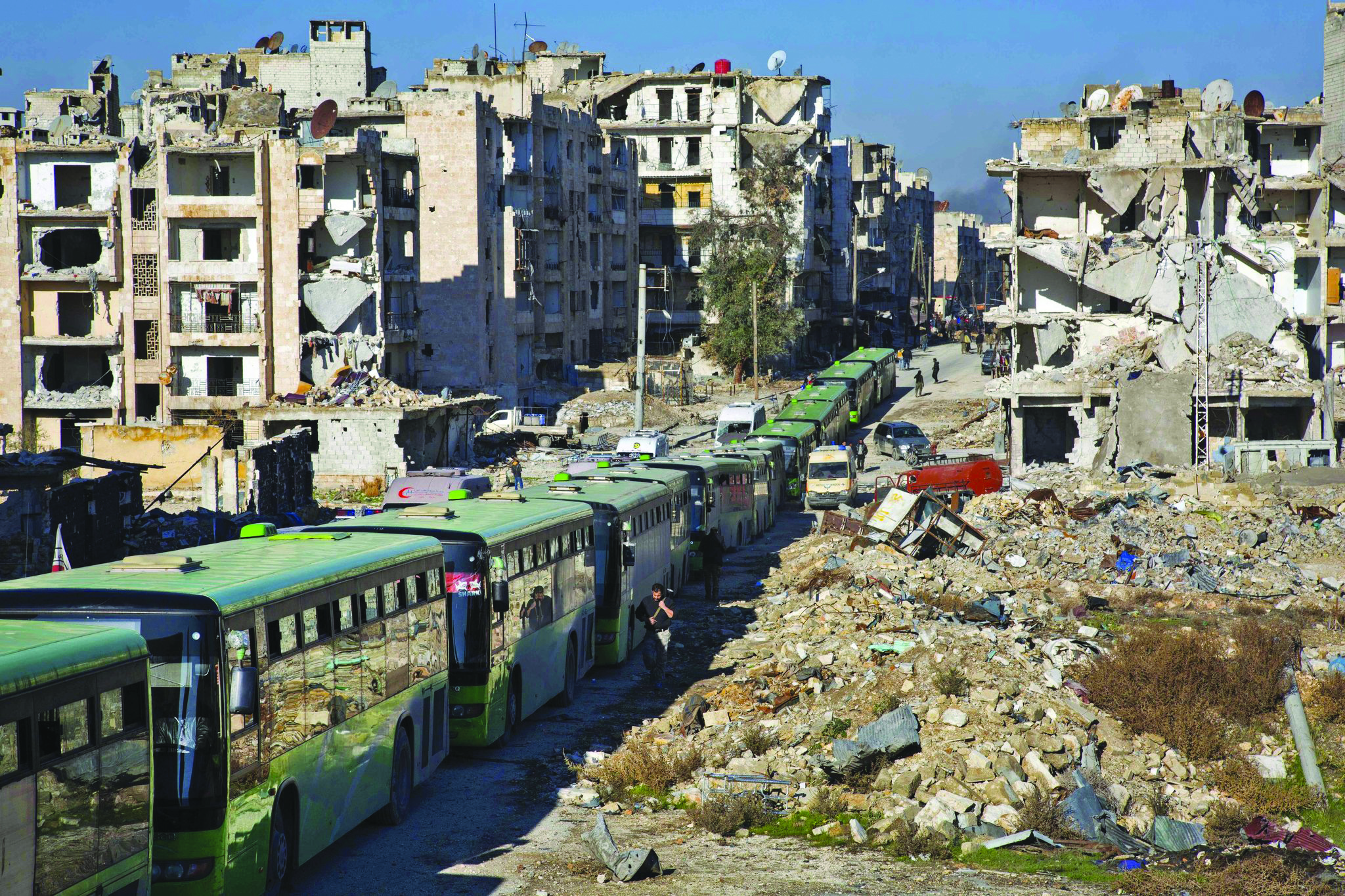 Krafter som i söndags satte eld på de gröna bussarna i ett försök att stoppa evakueringen av civila från de av ”rebeller” belägrade städerna Foua och Kefraya.