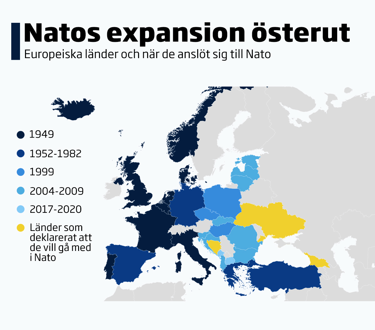 Nato har sedan Bakers löfte till Gorbatjov utvidgats med 14 länder österut, backat upp den fascistledda kuppen i Ukraina 2014, pumpat in vapen och militära rådgivare i Ukraina och vägrar gå med på Rysslands röda linje att Ukraina inte ska bli medlem i Nato – en USA-styrd organisation vars huvudsakliga syfte är att garantera USA:s världsherravälde.