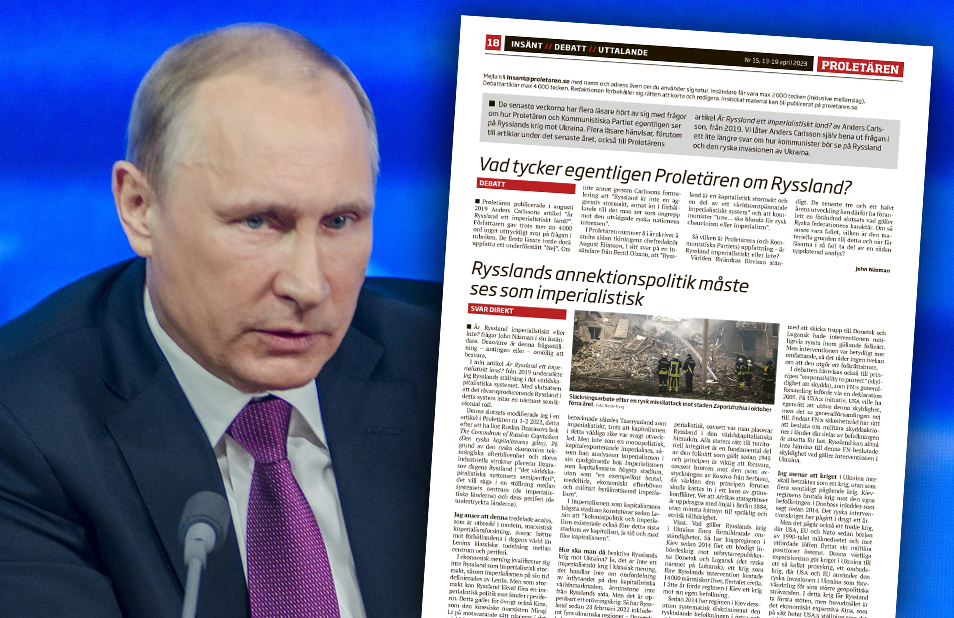 Proletären publicerade i augusti 2019 Anders Carlssons artikel ”Är Ryssland ett imperialistiskt land?”. Författaren gav trots mer än 4.000 ord inget uttryckligt svar på frågan i rubriken. De flesta läsare torde dock uppfatta ett underförstått ”Nej”. Om inte annat genom Carlssons formulering att ”Ryssland är inte en aggressiv stormakt, annat än i förhållande till det man ser som angrepp mot den utvidgade ryska nationens intressen”.