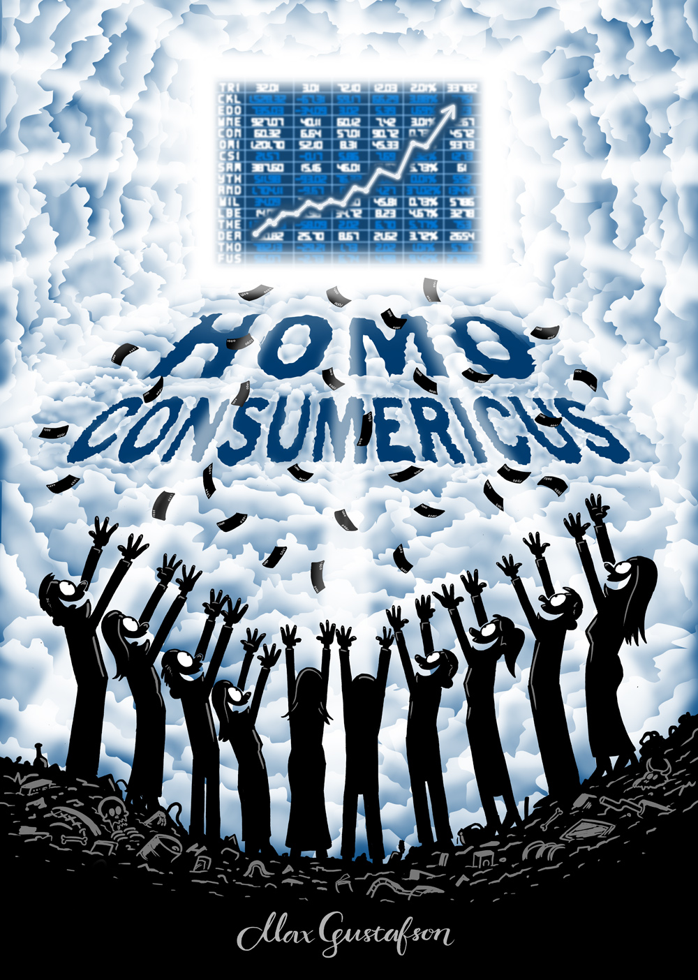 I Max Gustafsons senaste bok – Homo Consumericus – är det konsumtionshysterin som får sig en känga. Idén för boken kommer från en väggmålning han gjorde på en utställning i Helsingborg: en tillbedjande skara som lyfter sina händer mot en börsgraf. Väggmålningen ackompanjerades också av en röst från en högtalare som skanderar ut affirmationer om att “satsa på dig själv”. Skit i miljön. Skit i samhället. Det är du som är viktig.