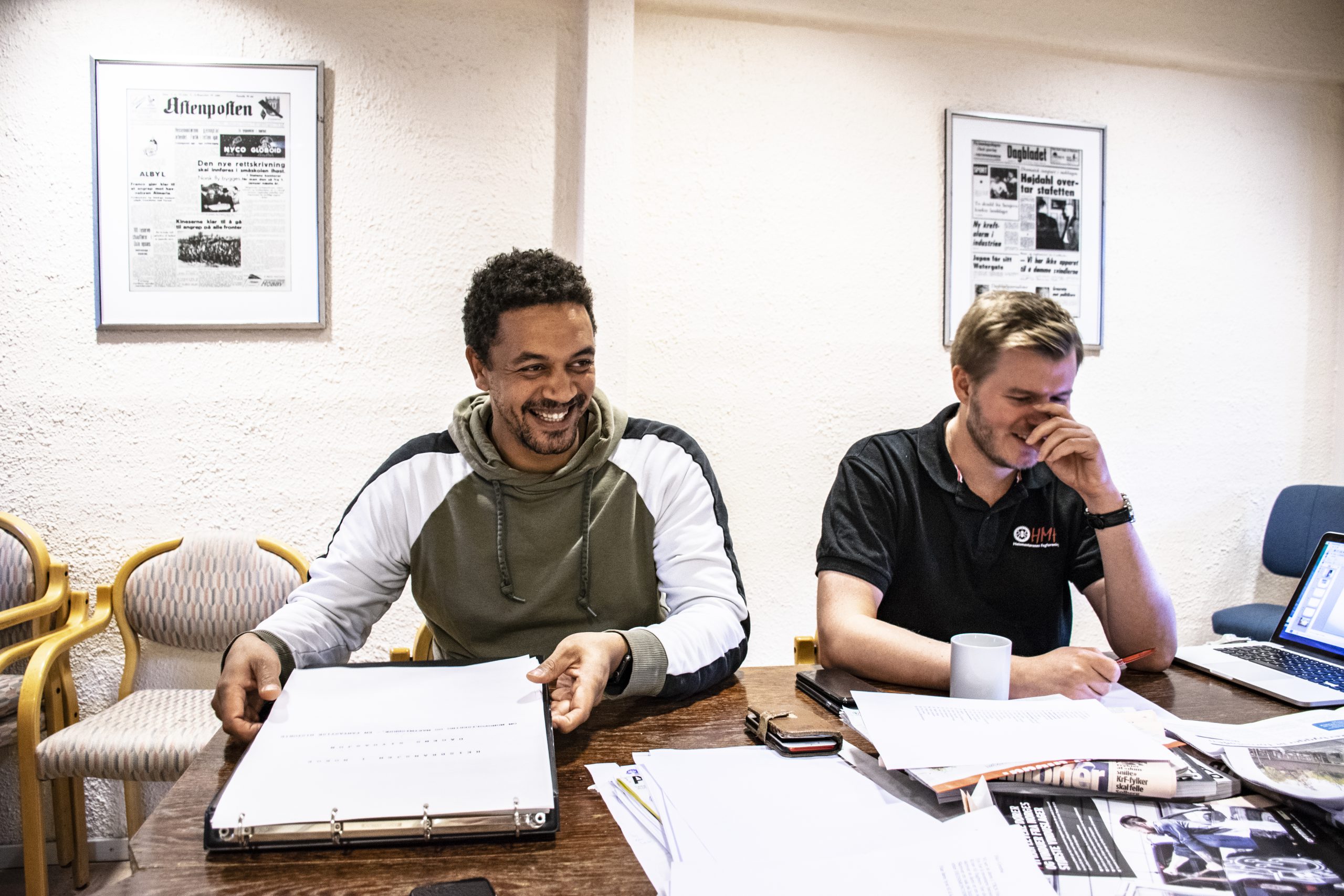 Det är Markus Hansen och David Coron-Andersen som tar emot och bjuder på kaffe. HMF:s tidigare ordförande Per Arne Salo kommer också förbi kontoret en sväng.