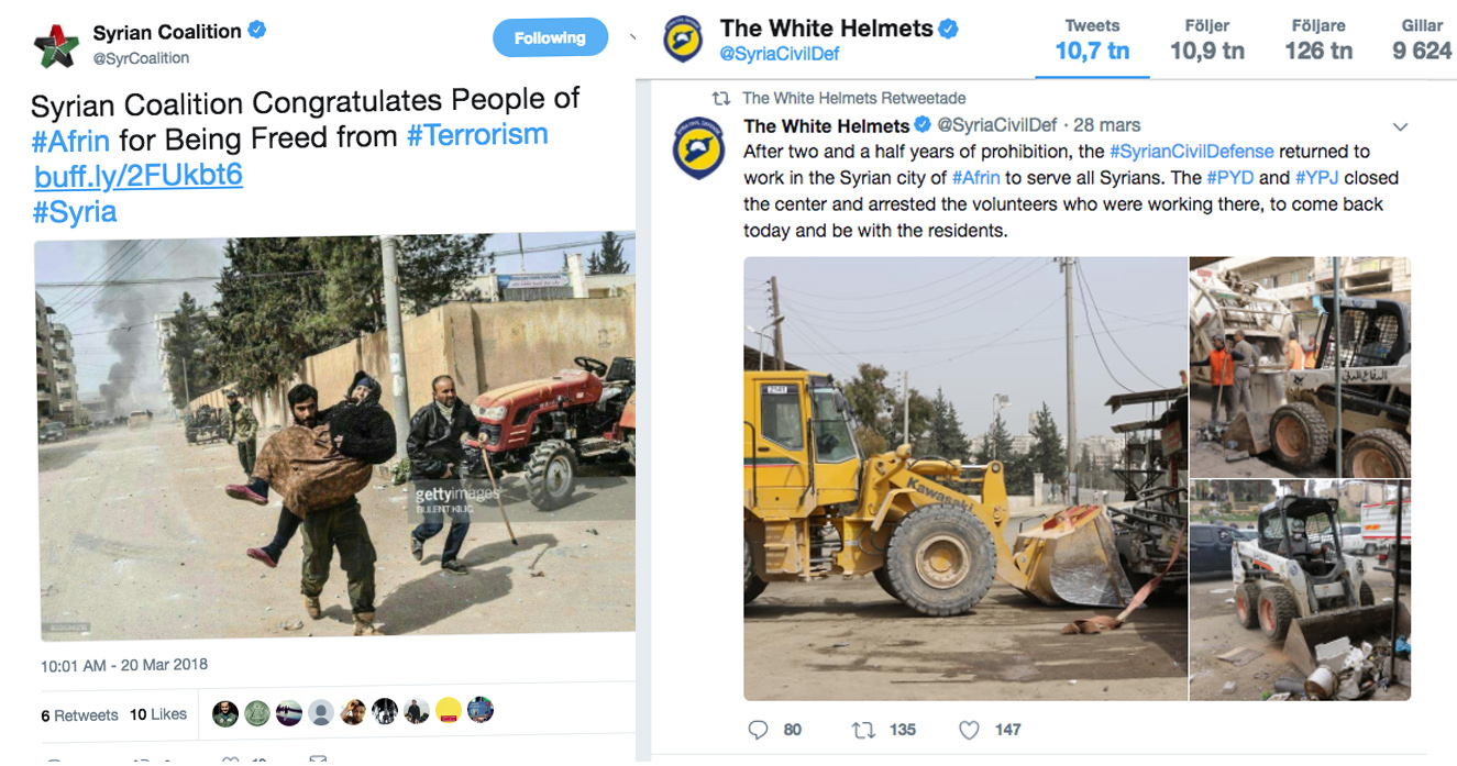 Den 28 mars, åtta dagar efter att Turkiet och Fria syriska armén ”befriade” Afrin var alltså Vita hjälmarna på plats i staden. De publicerade bilder och filmer som visade hur hjälparbetare städade upp staden för att göra det möjligt för invånarna att åter leva där.